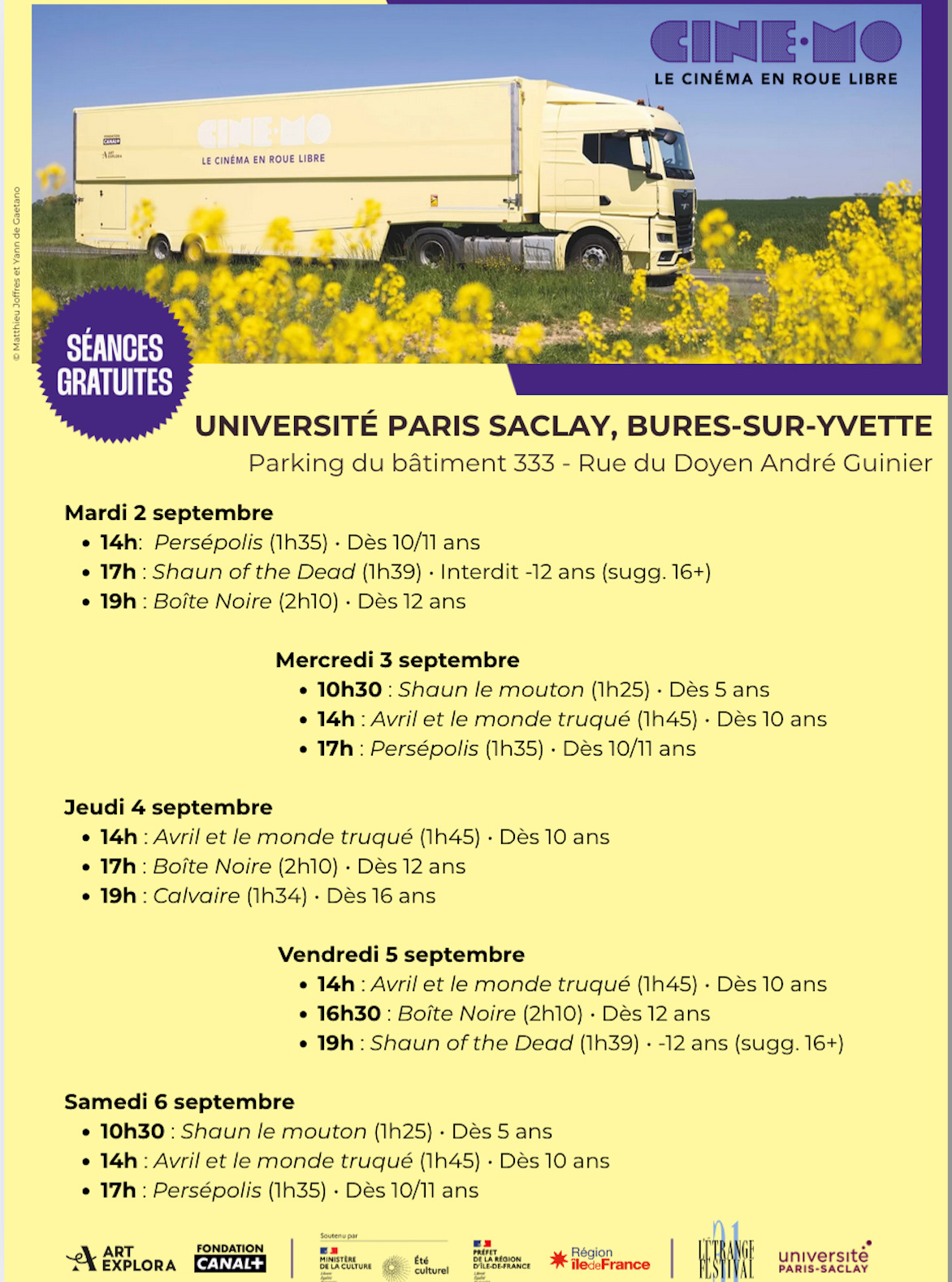 À l’occasion de sa 31e édition, L’Étrange festival s’associe à CinéMo, le cinéma mobile gratuit ! pour une pleine semaine de programmation pour petits et grands et sur le site de l’Université Paris-Saclay à Bures-sur-Yvette, du mardi 2 au samedi 6 septembre.